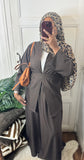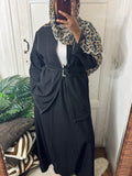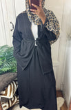 Encolure : ouverte en V, pensée pour être portée avec un haut ou un sous-abaya clair, comme ici.